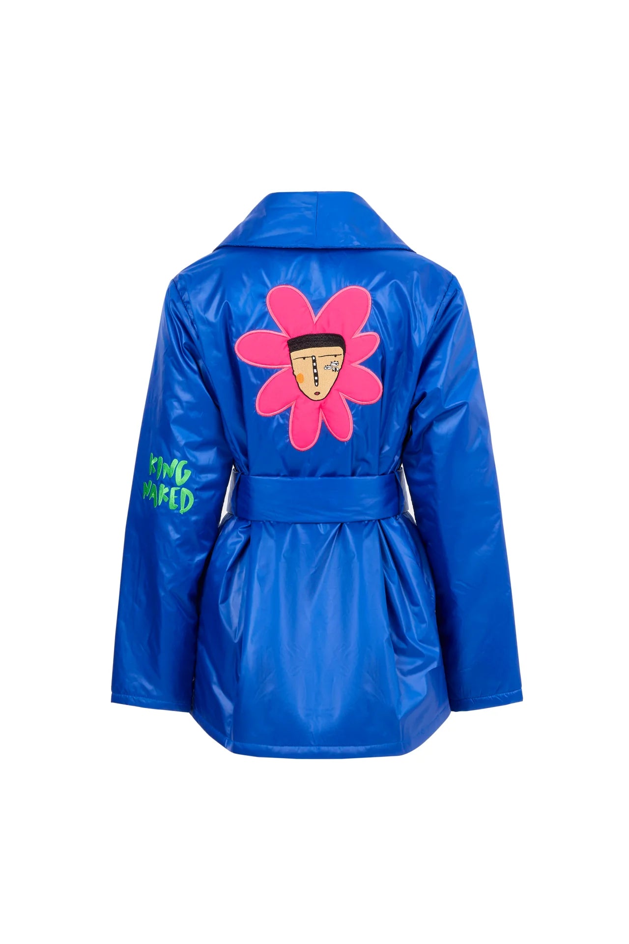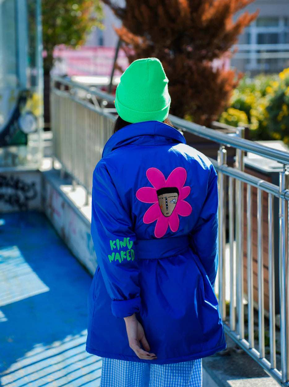 Arka bedende “Late Bloomer” fuşya çiçek aplikesi