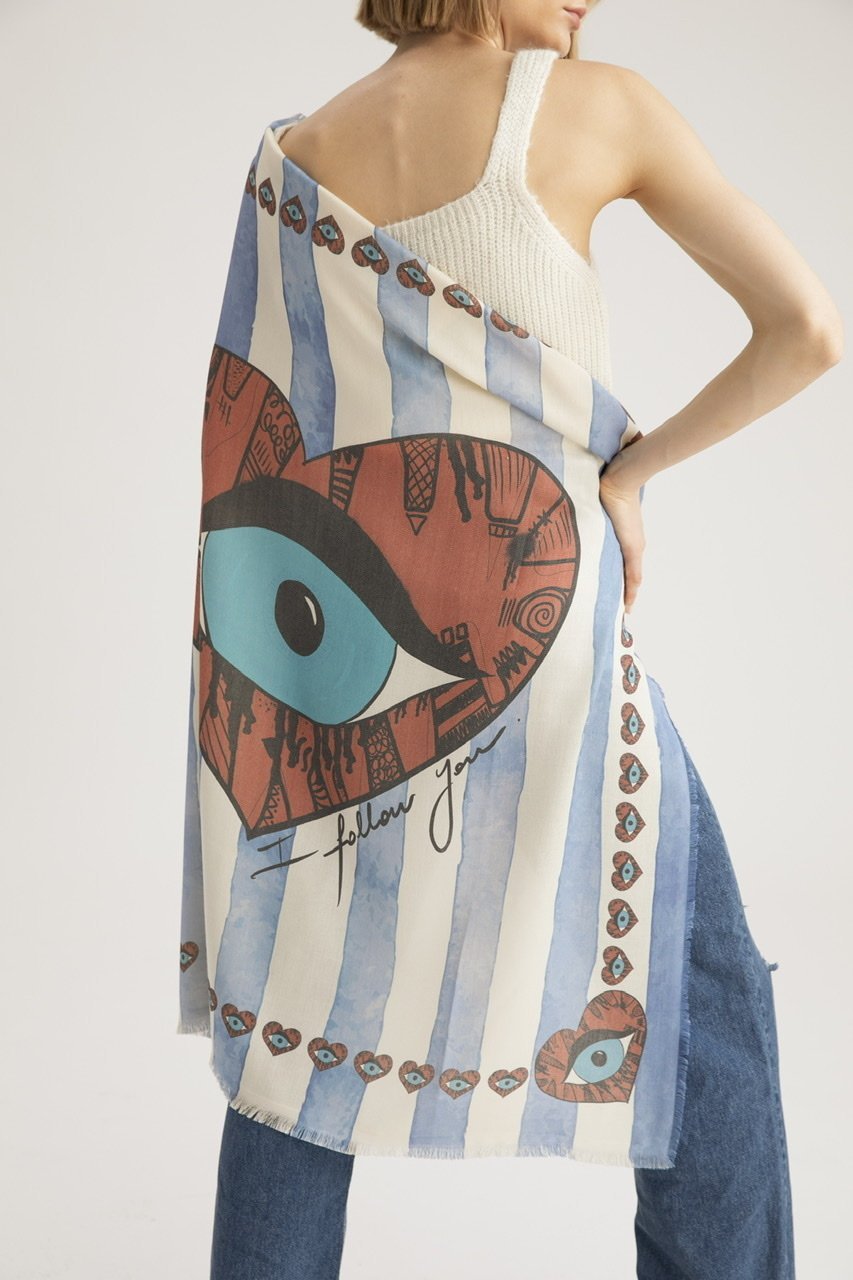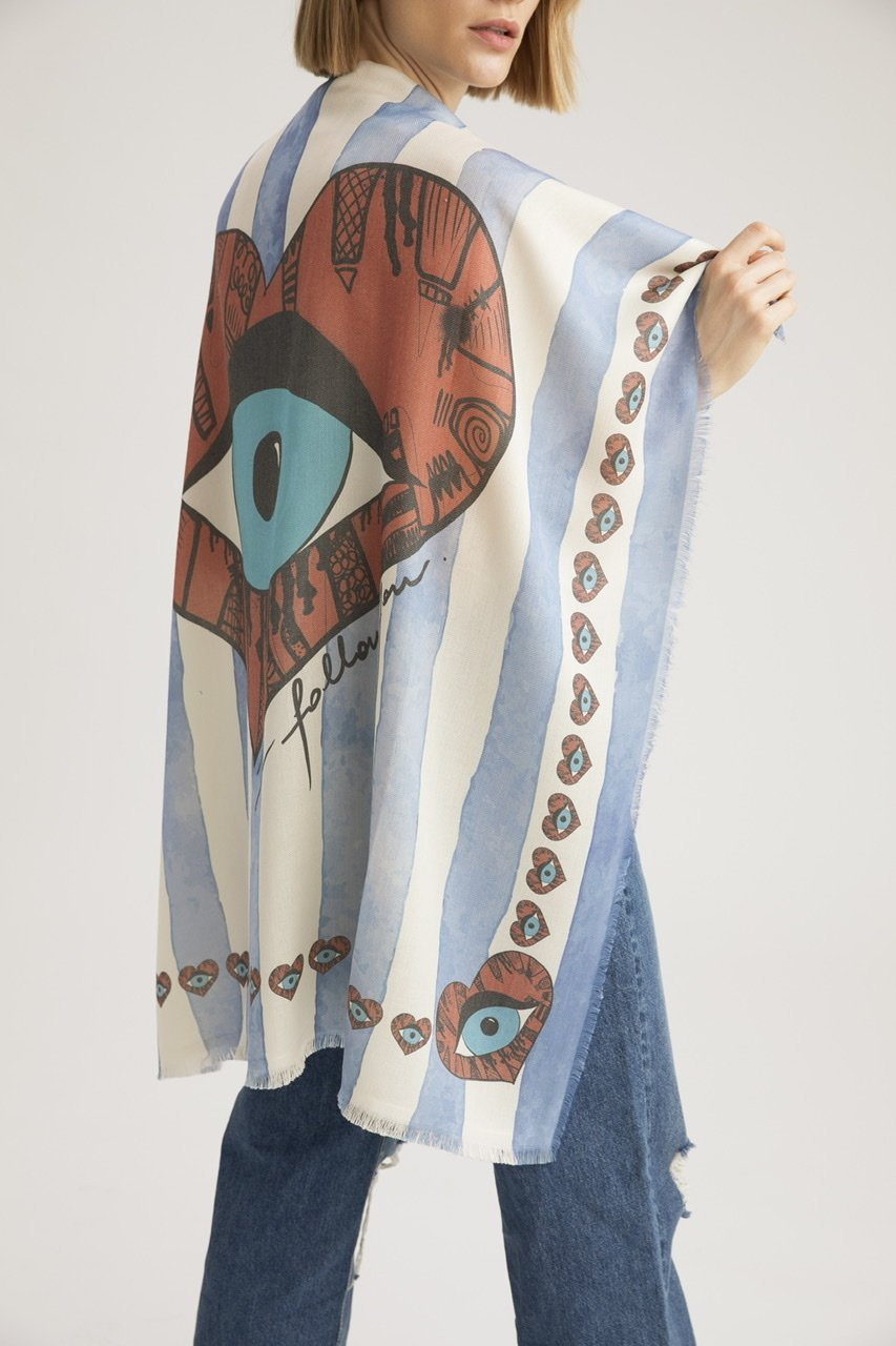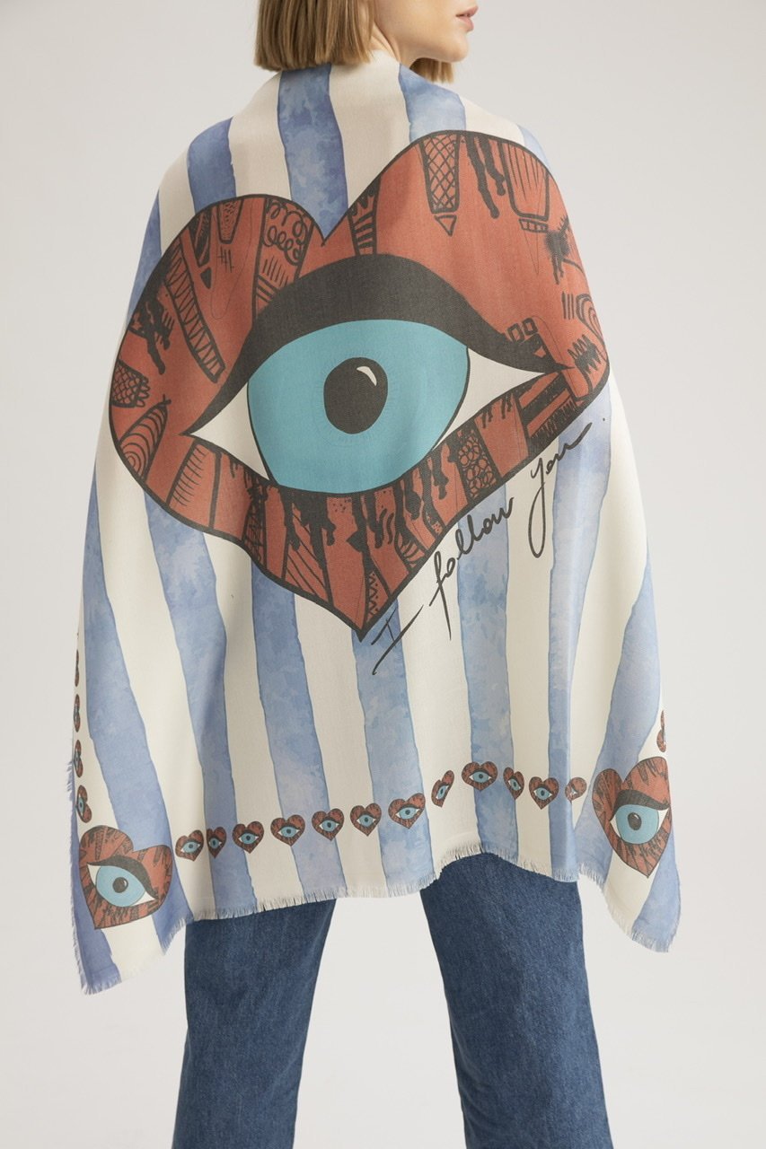 Kalp ve göz illüstrasyonlu kare kışlık şal
